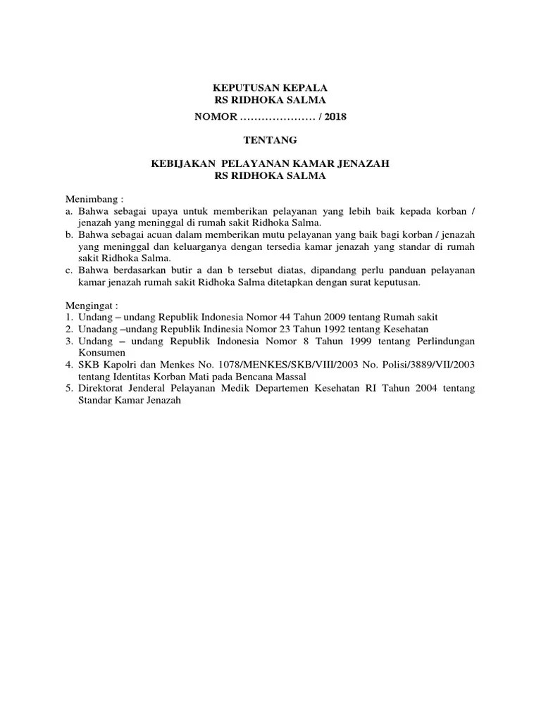 Contoh Sk Panduan Pelayanan Kamar Jenazah - 2 : Igd/poliklinik / kamar terima yang dibawa petugas atau pasien/keluarga pasien.. Standar pelayanan instalasi pemularasan jenazah. Standar pelayanan pemulasaraan jenazah di instalasi forensik. 05 maret 2016 08:30:16 wib. Igd/poliklinik / kamar terima yang dibawa petugas atau pasien/keluarga pasien. Keputusan menkes ri nomor 270/menkes/sk/iii/2007 tentang pedoman manajerial rumah sakit dan fasilitas kesehatan lainnya 5.